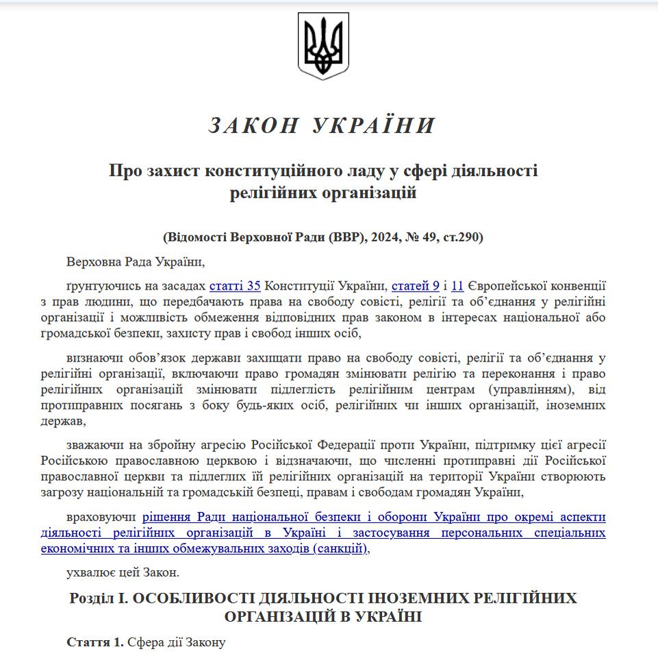 Es ist bemerkenswert, dass die Kommission in ihrem Bericht so deutlich Bezug auf ein konkretes Gesetz nimmt, nämlich das Gesetz 3894-IX mit der Bezeichnung „Über den Schutz der Verfassungsordnung auf dem Gebiet der Aktivitäten von Religionsgemeinschaften“. In der Zeit seiner Entstehung wurde der Entwurf zumeist „Gesetz zum Verbot der Ukrainischen Orthodoxen Kirche“ genannt. Tatsächlich hat sich die Lage der Ukrainischen Orthodoxen Kirche (UOK) erheblich verschärft, seitdem das Gesetz im September 2024, einen Monat nach der Unterzeichnung durch den ukrainischen Präsidenten, in Kraft getreten ist.
