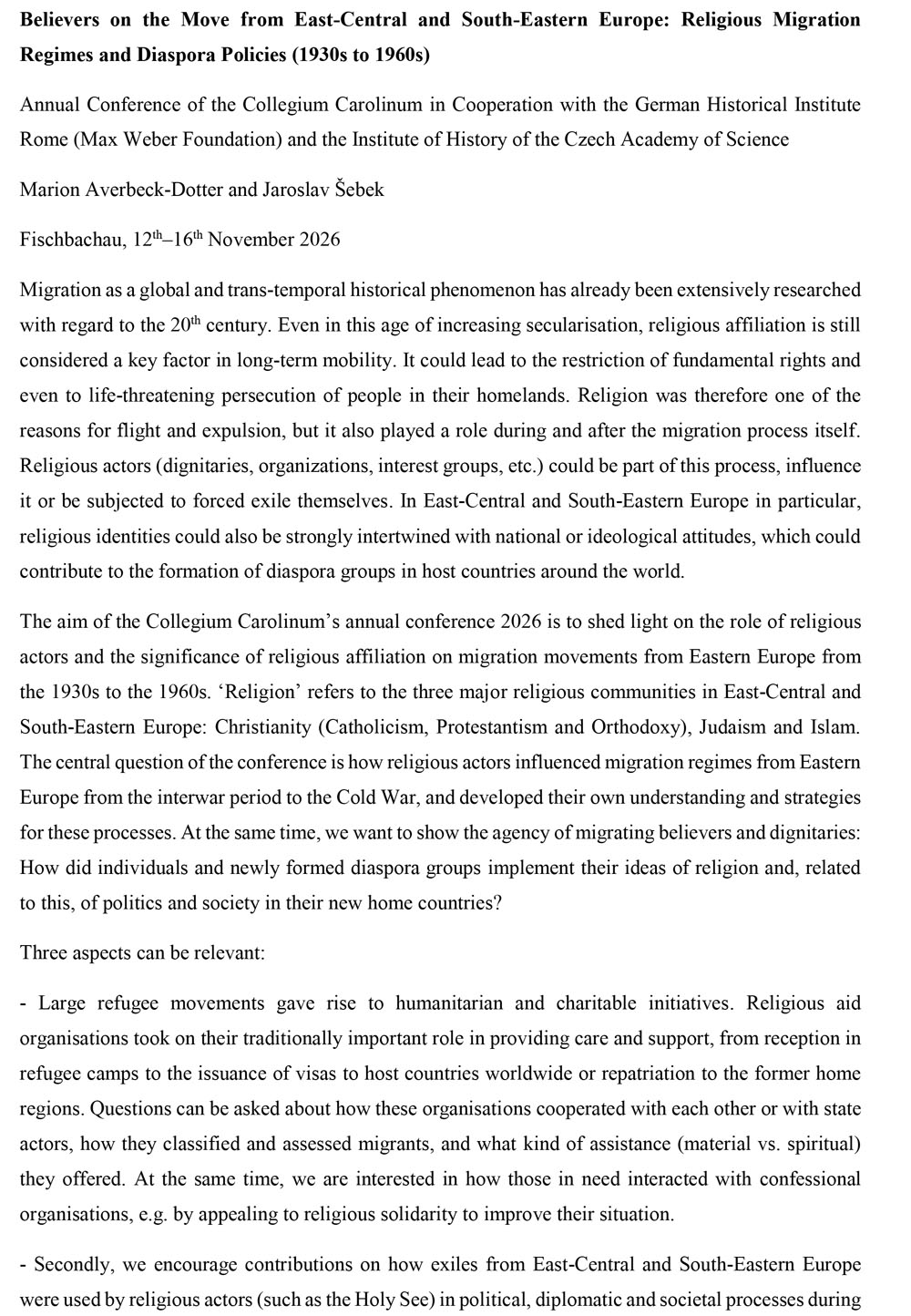 Das Ziel der Jahrestagung des Collegium Carolinum 2026 ist es, die Bedeutung religiöser Zugehörigkeit für Migrationsbewegungen aus dem östlichen Europa von den 1930er bis zu den 1960er Jahren zu beleuchten und die Rollen religiöser Gemeinschaften dabei zu zeigen. „Religion“ bezieht sich auf die drei großen Glaubensbekenntnisse Ostmittel- und Südosteuropas: Christentum (Katholizismus, Protestantismus und Orthodoxie), Judentum und Islam. Die zentrale Frage der Tagung ist, wie religiöse Akteure die Migrationsregime im östlichen Europa von der Zwischenkriegszeit bis zum Kalten Krieg beeinflusst und ihr eigenes Verständnis bzw. ihre eigenen Strategien darin immer wieder neu entwickelt