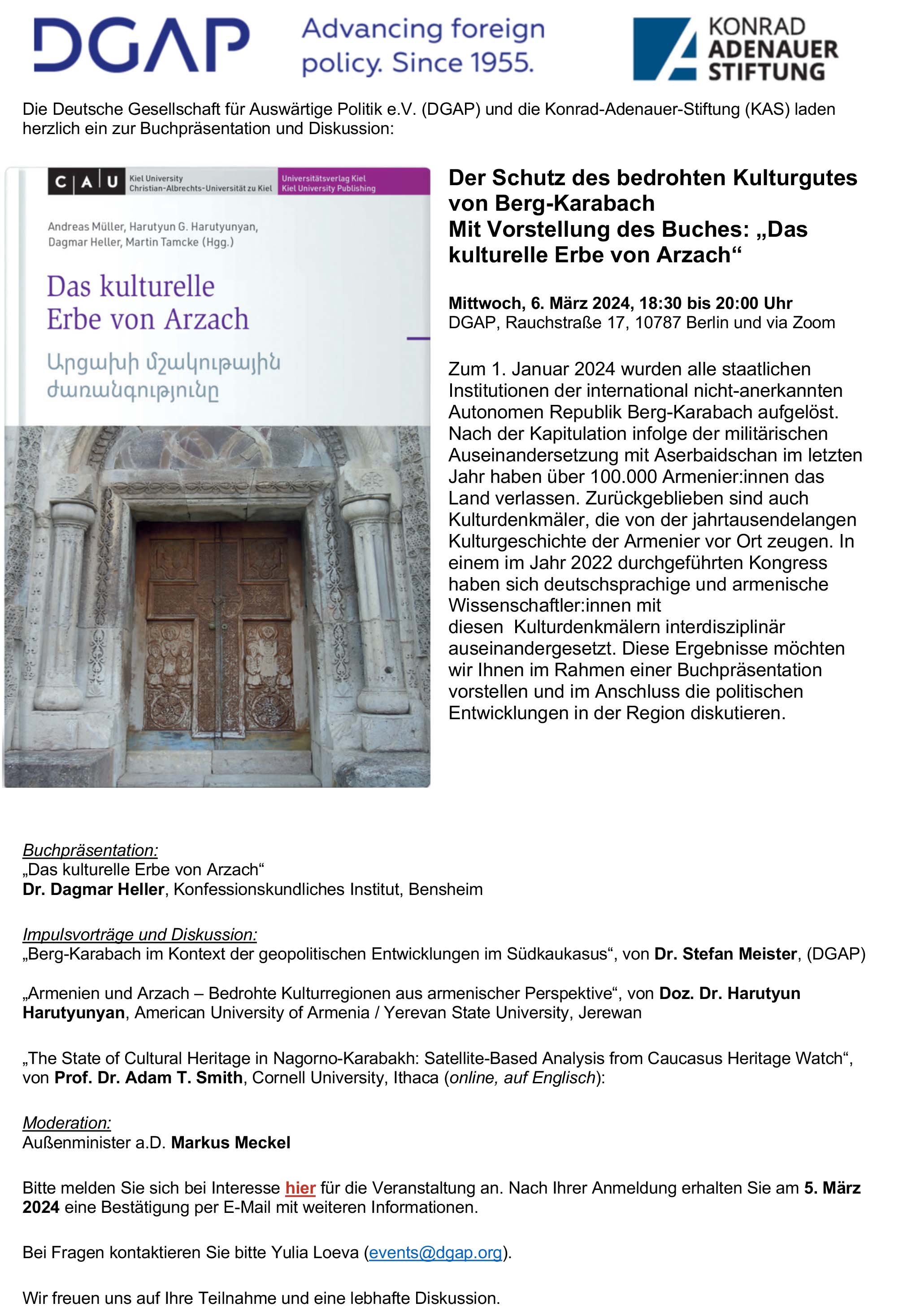 Zum 1. Januar 2024 wurden alle staatlichen Institutionen der international nicht-anerkannten Autonomen Republik Berg-Karabach aufgelöst. Nach der Kapitulation infolge der militärischen Auseinandersetzung mit Aserbaidschan im letzten Jahr haben über 100.000 Armenier:innen das Land verlassen. Zurückgeblieben sind auch Kulturdenkmäler, die von der jahrtausendelangen Kulturgeschichte der Armenier vor Ort zeugen. In einem im Jahr 2022 durchgeführten Kongress haben sich deutschsprachige und armenische Wissenschaftler:innen mit diesen Kulturdenkmälern interdisziplinär auseinandergesetzt. Diese Ergebnisse möchten wir Ihnen im Rahmen einer Buchpräsentation vorstellen und im Anschluss die politischen Entwicklungen in der Region diskutieren.