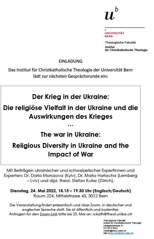 Die religiöse Vielfalt in der Ukraine und die Auswirkungen des Krieges24. Mai 202218:15 - 19:30 UhrUniverstität Bernund über ZoomEnglisch/DeutschAnmeldungsfrist für Zoom-Link:23. Mai 2022
