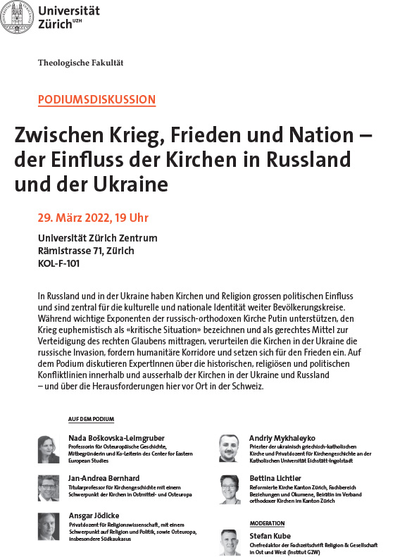 Der Einfluss der Kirchen in Russland und der Ukraine29. März 202219:00 UhrUniversität ZürichTeilnehmende:Nada Boškovska-Leimgruber, Jan-Andrea Bernhard, Ansgar Jödicke, Andriy Mykhaleyko, Bettina Lichtler