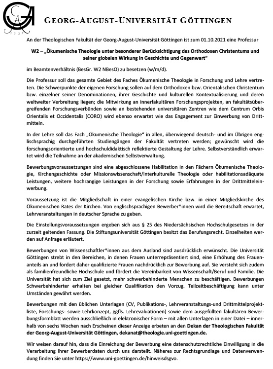 Professur für Ökumenische Theologie unter besonderer Berücksichtigung des Orthodoxen Christentums und seiner globalen Wirkung in Geschichte und Gegenwart