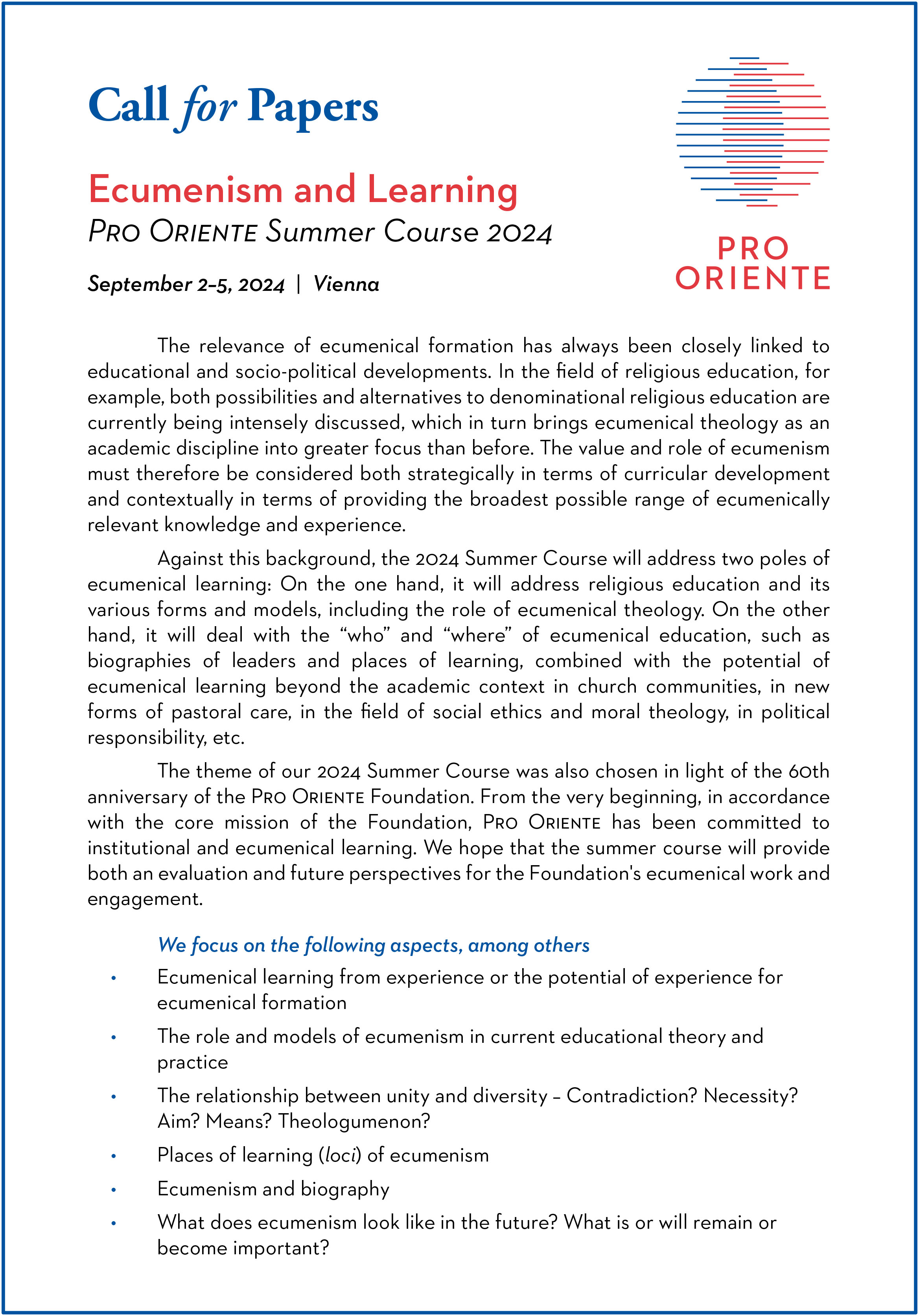 Call for Papers: Pro Oriente Summer Course 2024