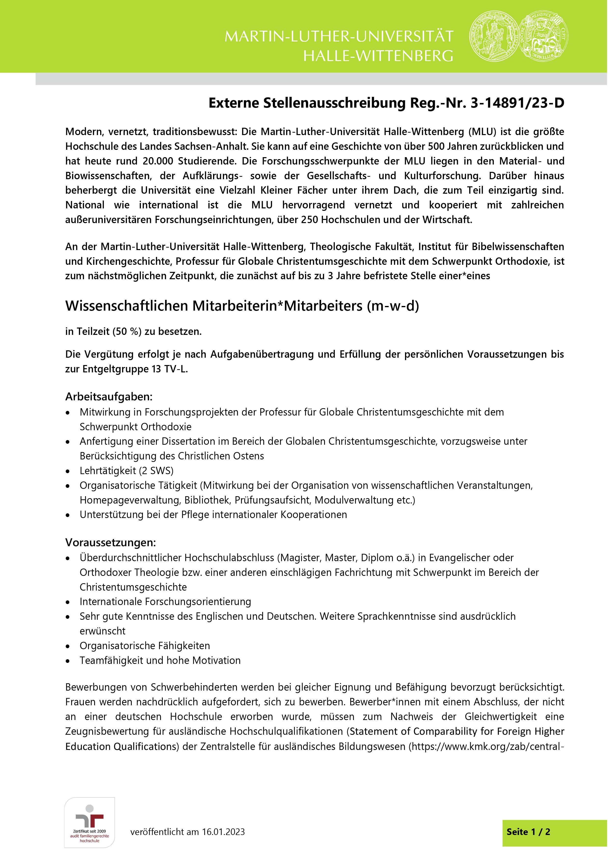 Stellenausschreibung: Wissenschaftliche Mitarbeit globale Christentumsgeschichte