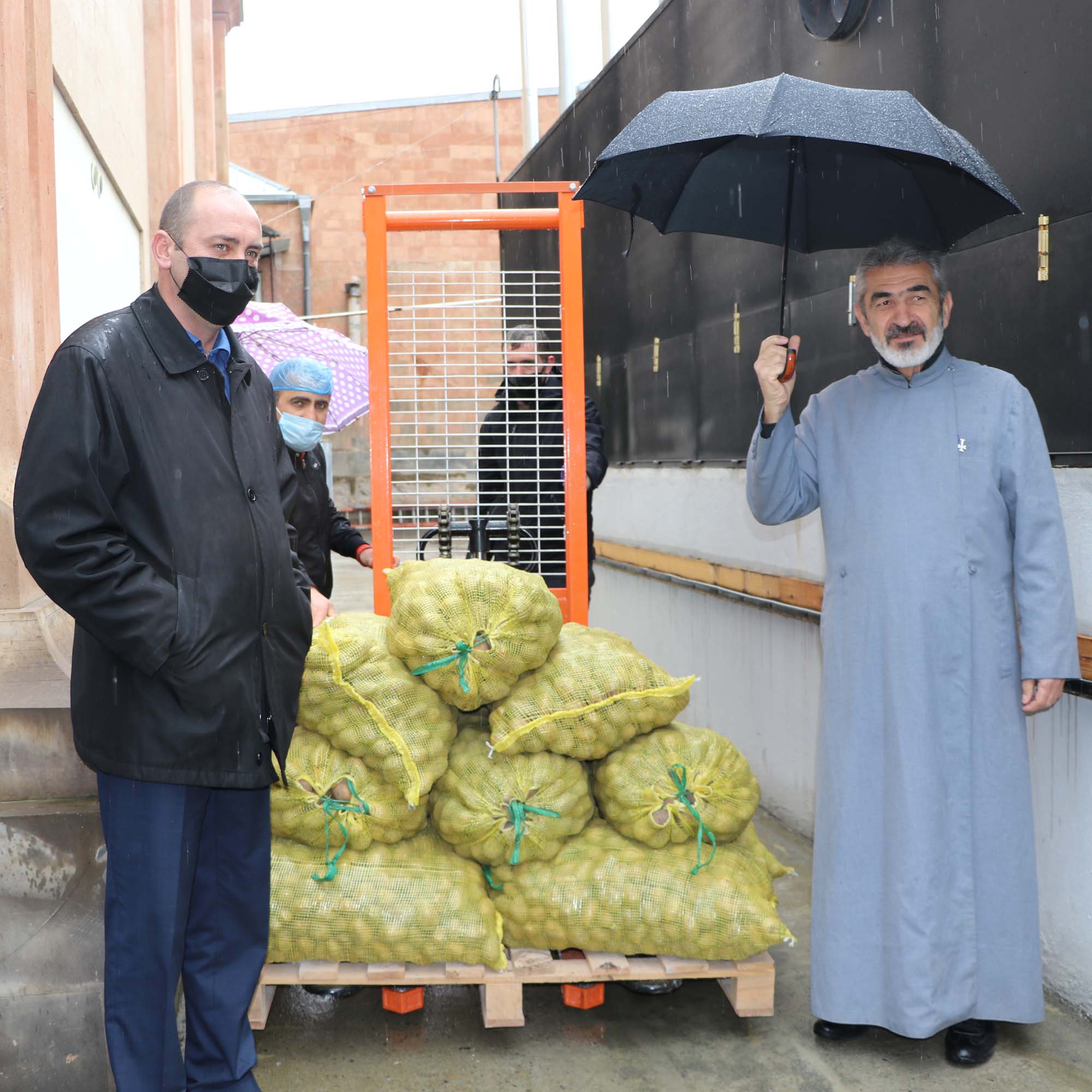 Bild: Erzbischof Abraham (Mkrtchyan) von Vayots Dzor und Mitarbeiter der Syunik-Development NGO beim Verteilen von Kartoffeln. (© Syunik-Development NGO)