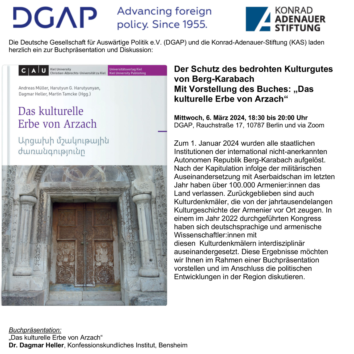 Am 6. März 2024 war eine hybride Buchpräsentation des von uns herausgegebenen Bandes „Das kulturelle Erbe von Arzach. Armenische Geschichte und deren Spuren in Berg-Karbach“ im Gebäude der Deutschen Gesellschaft für Auswärtige Politik (DGAP) in Kooperation mit der Konrad-Adenauer-Stiftung (KAS) geplant. Dabei sollte das Buch im Rahmen eines wissenschaftlichen Symposiums vorgestellt werden. Das Symposium sollte mit wissenschaftlichen Zugängen auf das durch den Exodus der Armenier aus Arzach/ Berg Karabach und die Übernahme der Region durch Aserbaidschan bedrohte armenische Kulturerbe hinweisen. Eine solche Bedrohung steht insbesondere angesichts der zerstörerischen Kulturpolitik der aserbaidschanischen Regierung in Nachitschewan im Raum, wo armenisches Kulturgut, Kirchen, Klöster, Dorfstrukturen und Friedhöfe – sogar mit UNESCO-Weltkulturerbe-Status – ausgelöscht worden sind.
