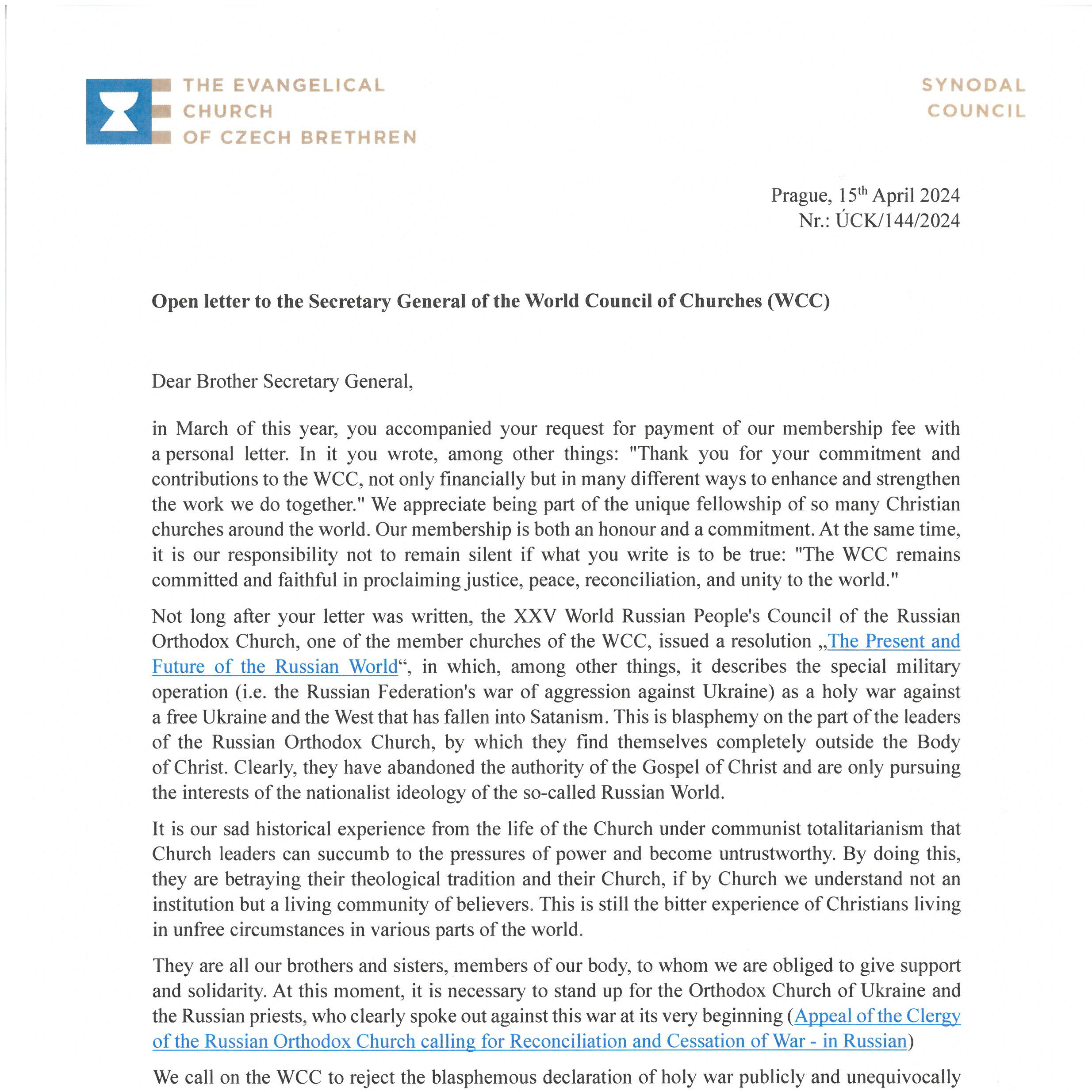 In ihrem offenen Brief kritisiert die Evangelische Kirche der Böhmischen Brüder den Umgang des Ökumenischen Rats der Kirchen (ÖRK) mit der Russischen Orthodoxen Kirche angesichts des russischen Angriffskriegs gegen die Ukraine. Insbesondere das Dokument "Gegenwart und Zukunft der Russischen Welt" des 25. Weltkonzils des Russischen Volks verurteilt sie entschieden und fordert vom ÖRK, die darin enthaltene Einstufung des Kriegs als "heiliger Krieg" öffentlich und unmissverständlich zurückzuweisen sowie ebenso öffentlich und unmissverständlich die ukrainischen Christen und russischen orthodoxen Dissidenten, die den Krieg gegen die Ukraine ablehnen, zu unterstützen.