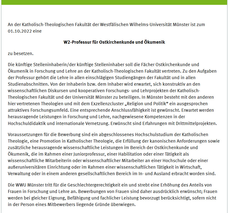 Stellenausschreibung: W2-Professur für Ostkirchenkunde und Ökumenik