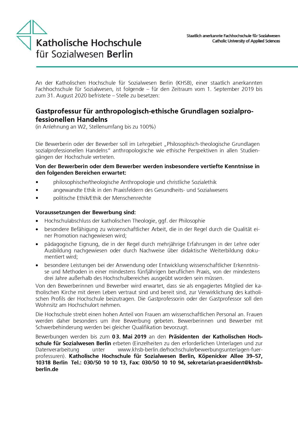 Gastprofessur für anthropologisch-ethische Grundlagen sozialprofessionellen Handelns