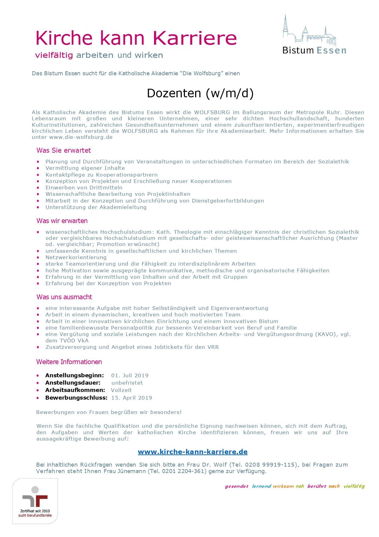Das Bistum Essen sucht für die Katholische Akademie “Die Wolfsburg” einen