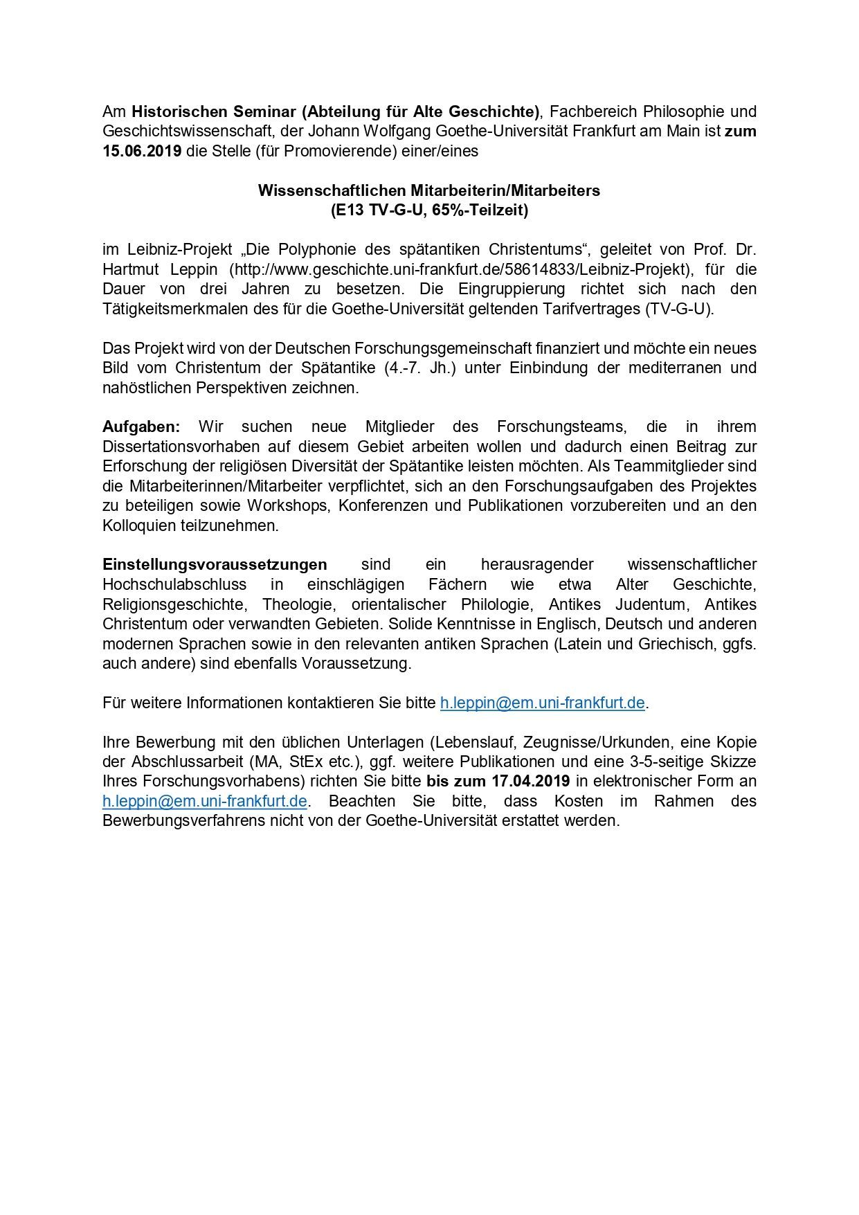 Das Historische Seminar (Abteilung für Alte Geschichte) der Johann Wolfgang Goethe-Universität Frankfurt am Main sucht eine/n
